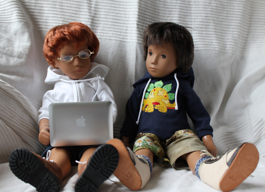 Harry is trying out some glasses...while using Henry's Macbook to write an email to his Mum.